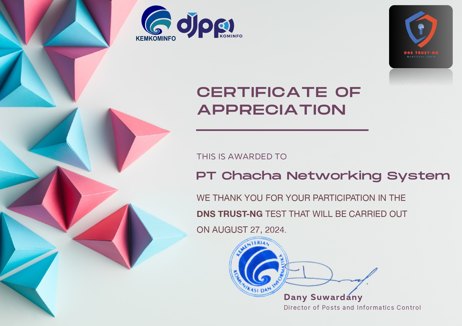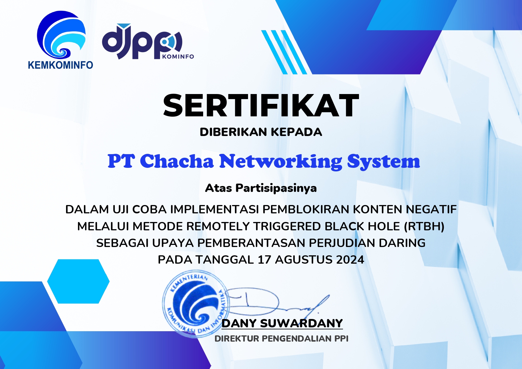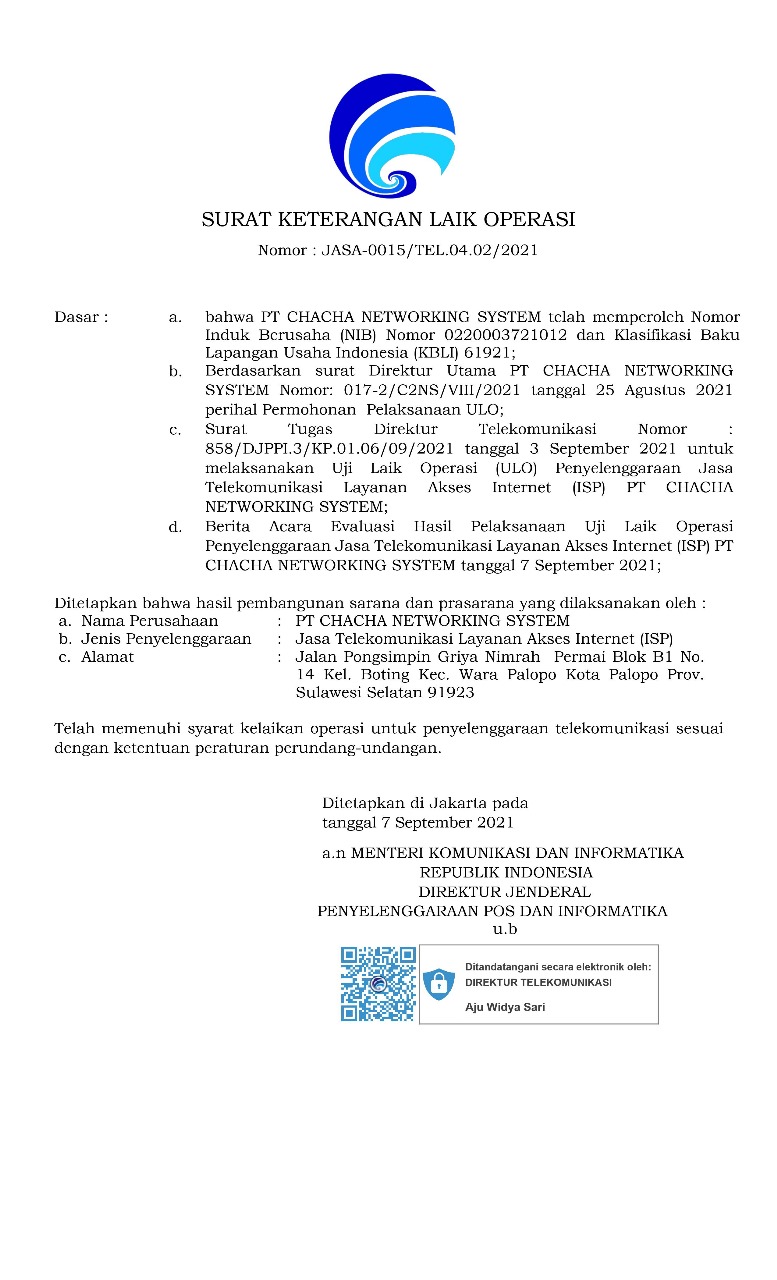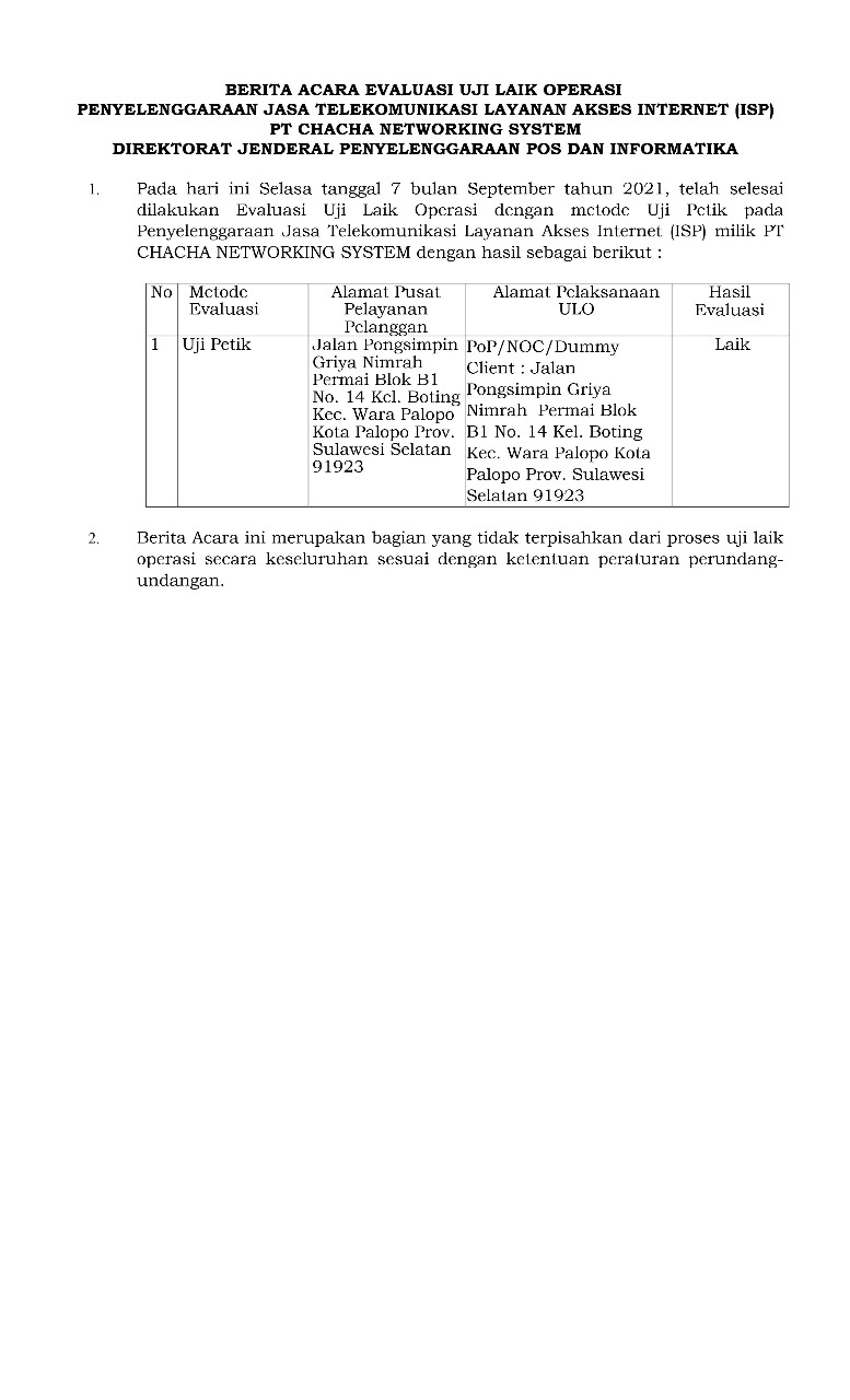 PT. Chacha Networking System didirikan dengan tujuan untuk memenuhi kebutuhan masyarakat akan informasi global, dimana kami percaya bahwa posisi kami sebagai salah satu perusahaan IT, khususnya Penyedia Layanan Jasa Akses Internet (ISP), akan dihadapkan dengan kebuutuhan yang tinggi dalam hal layanan media informasi dan komunikasi.